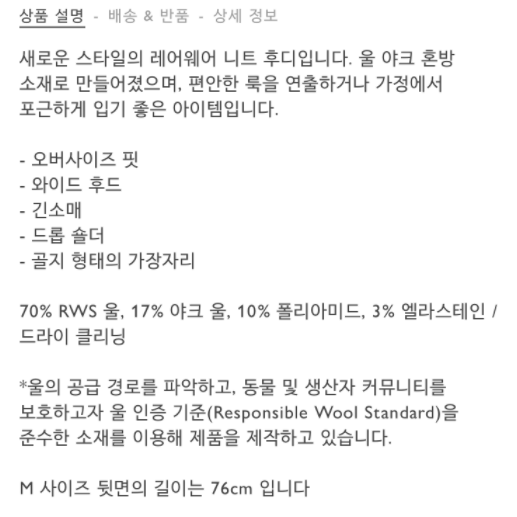 울이라서 꼬불꼬불 재질에 후디... RWS울이라 뭔가 했더니 동물 및 생산자 커뮤니티를 보호하는 울 인증 기준을 준수한 소재라고 한다. 요즘은 브랜드의 ESG가 중요하니, 요런 것도 꼼꼼히 봐야 한다.ㅎㅎ