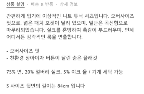 니티드 튜닉 셔츠 40% 정도 할인가로 75000에 구매했다.